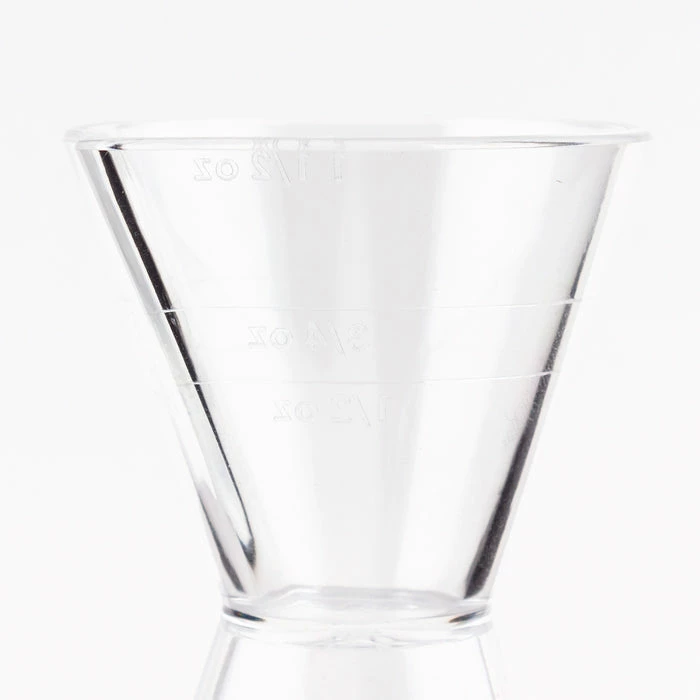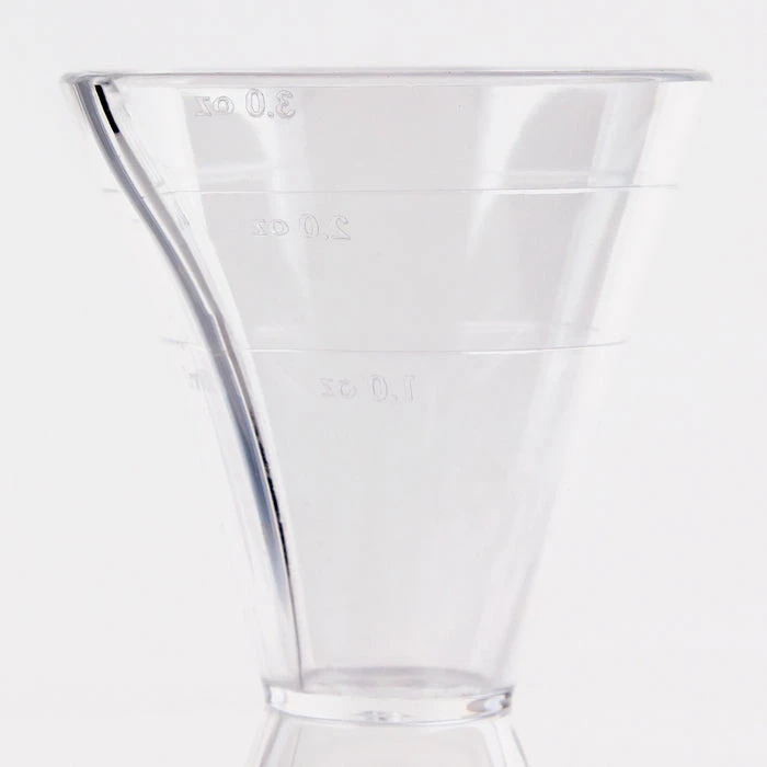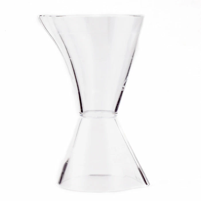 All bartenders know that accurate liquor measurements are critical in maintaining a consistently delicious cocktail. This Jigger is made from a strong clear durable plastic that includes measuring lines to help you get an accurate pour. It even has a spout design on both ends to make poring less messy. This jigger is 4.25 inches in height and is very lightweight. The larger side holds up to 3oz of liquid and the smaller side holds up to 1 1/2oz of liquid.