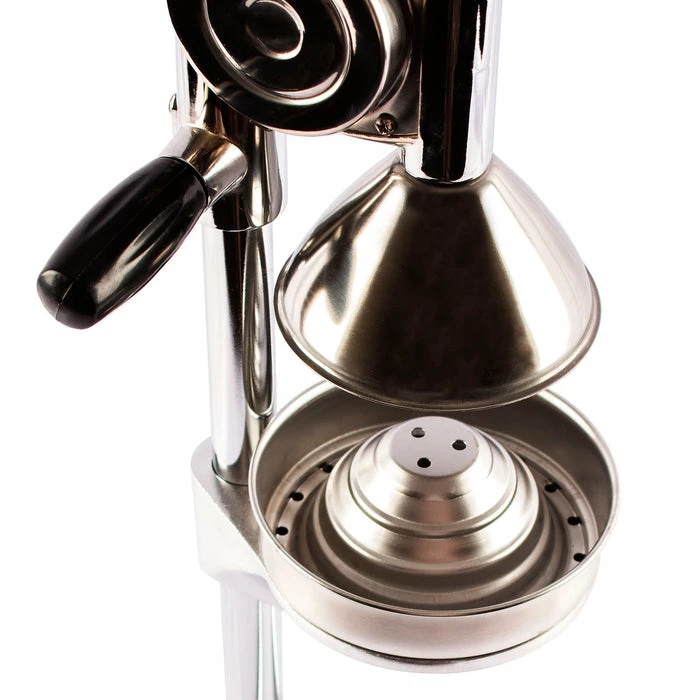 This manual juicer is a must have for any bar or restaurant.. It’s 25″ tall with an 8.25″ long base. With components made of stainless steel and zinc alloy, This unit is very easy to use, leaving nothing but peel behind. The base is very sturdy and has rubber feet to keep it in place. Simply place half of your fruit in the juicer and pull down the handle. The plunger is gear driven onto the fruit and then presses it between a cone shaped plate and a strainer, leaving the peel and seeds behind and the juice in the glass. The unit is very easy to disassemble and clean.