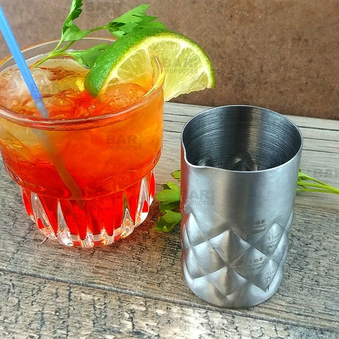 This stainless steel jigger with an embossed diamond pattern is the perfect jigger to add to your bartending ammo. It showcases convenient measurement lines of several different increments while featuring a built in spout to aid in spill proof pouring. The stainless steel design is modern and sleek while the diamond pattern adds a trendy element.