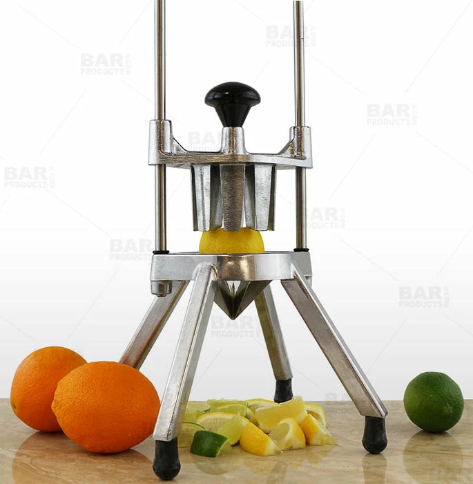 This high quality slicer is designed to slice through any type of citrus and fruit with ease. It is as simple as cutting off the ends of your fruit, placing it underneath the moveable pegs inside the cup of the stainless steel blades and applying pressure. You will have perfectly even sliced wedges every time.
