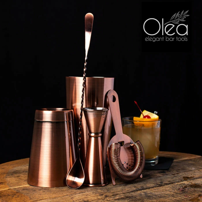 This beautiful bar set has everything you need to get you started with making super tasty cocktails. It comes with a 28oz and 16oz shaker tin set, a 2 prong strainer, a 2 oz cocktail jigger, and a twisted bar spoon. It is made of Stainless steel and has an antique copper finish giving it a beautiful and elegant shine that is sure to have not only you but your guest impressed with your gear.
