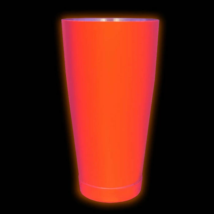This fun metallic orange cocktail shaker tin will surely get you excited to shake up your favorite spirits in style. This 28 ounce shaker tin is every master mixologists and professional bartenders dream bar tool. The high quality piece is constructed from a durable stainless steel material and then beautifully coated with a metallic orange finish. This cocktail shaker is also neon and glows brilliantly under a black light environment!