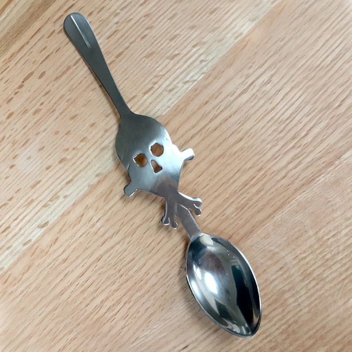 This long absinthe spoon is a stainless steel reproduction of the oldest designs of all absinthe spoons. It has sinister skull on the grill in the middle of the handle used to hold the sugar cube while preparing a traditional absinthe. Fun fierce pick your poison vibe, for the Green Fairy Drink. Drinkers would turn the spoon upside down and lay it across the glass to hold their sugar cube. Once the water is slowly poured over the cube and the sugar is dissolved, you would then use the spoon end to stir the sugar water and absinthe together.